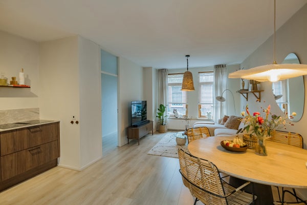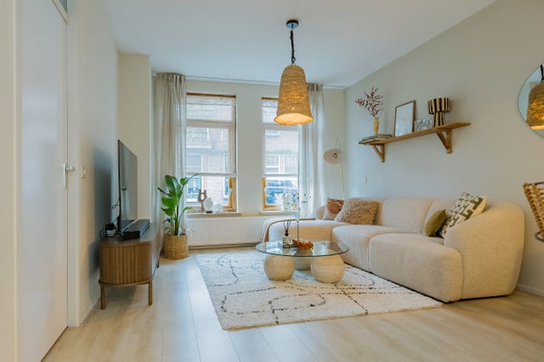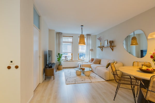 De frisse afwerking valt direct op. Het appartement heeft een lichte woonkamer aan de voorzijde, met grote ramen op het zuiden en daardoor heerlijk veel daglicht. De strakke wanden en licht eiken laminaat vloer geven het geheel een moderne, rustige uitstraling.