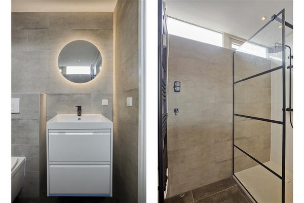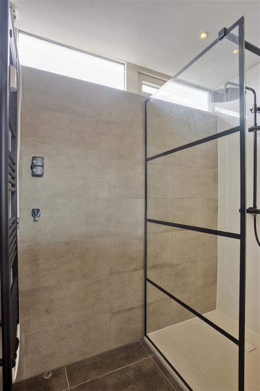 De moderne badkamer is recent (2024) volledig vernieuwd en ingericht met een glazen inloopdouche, toilet, mooi wastafelmeubel en handdoekradiator. Tevens bevindt zich hier de wasmachine/droger aansluiting.
