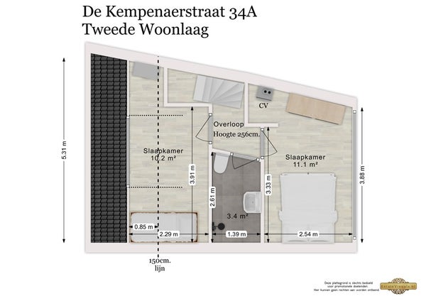 • De bovenwoning heeft een woonoppervlakte van 55 m² en beschikt over 3 kamers, waarvan 2 slaapkamers;