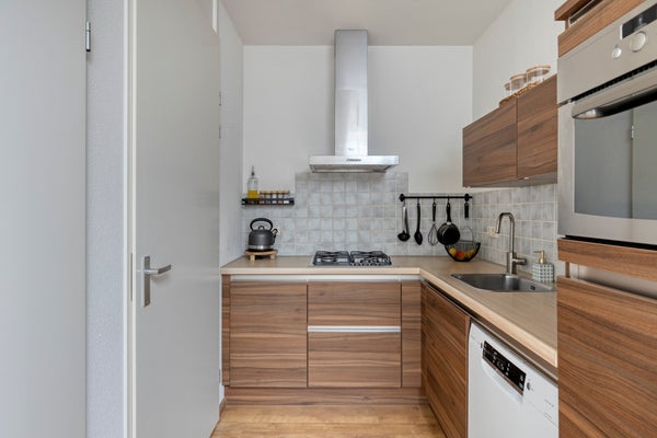 - De keuken is uitgevoerd met gaskookplaat, afzuigkap, spoelbak, inbouwkoelkast, combi-oven en vaatwasmachine;