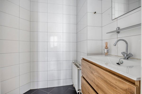 - De badkamer is volledig betegeld en voorzien van een inloopdouche en een wastafel;