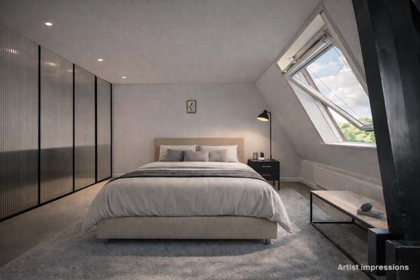 De ruime masterbedroom doet zijn naam eer aan: voorzien van inbouwkasten met hang- en leggedeelte, airconditioning en twee dakramen. Aangrenzend bevindt zich de moderne badkamer (2021), stijlvol afgewerkt met grijze vloer- en wandtegels. Hier vind je een ruime inloopdouche, wastafelmeubel, designradiator en sfeervolle verlichting. In een ingebouwde kast zijn de wasmachine en droger netjes weggewerkt. Ook vanuit de slaapkamer is er toegang tot het bal-kon.