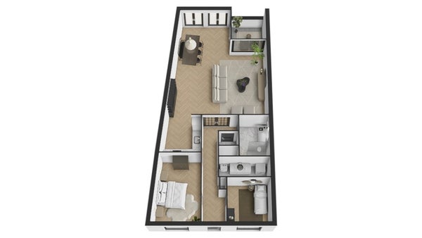 - De galerijflat heeft een woonoppervlakte van 97 m² en beschikt over 3 kamers, waarvan 2 slaapkamers;