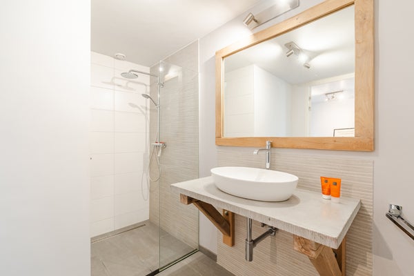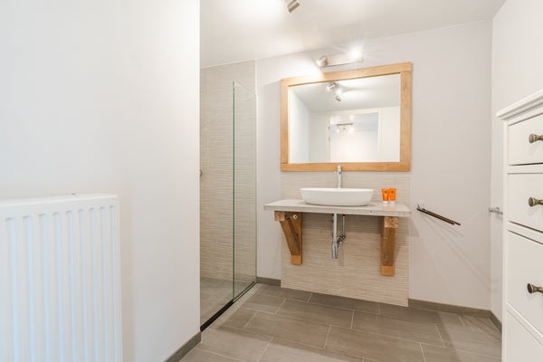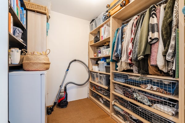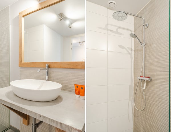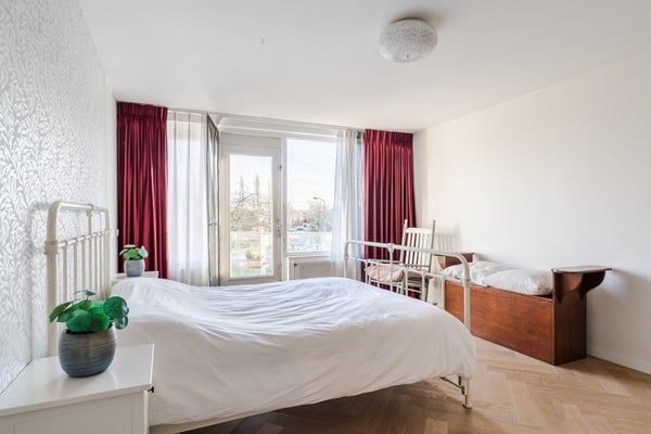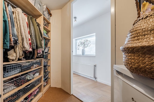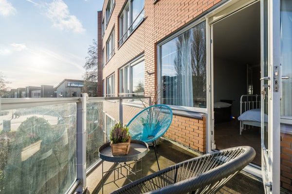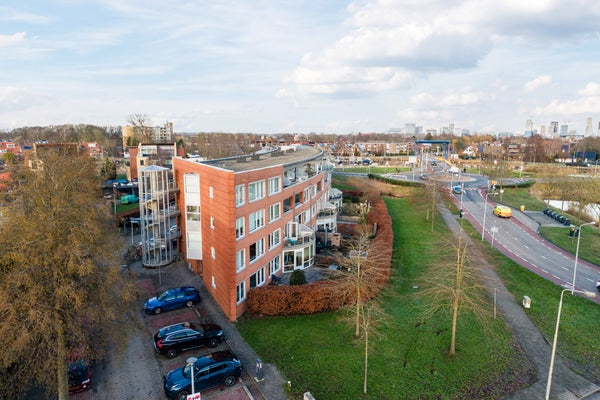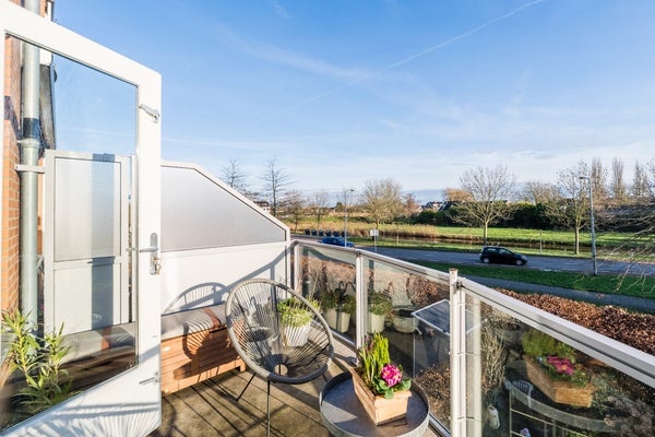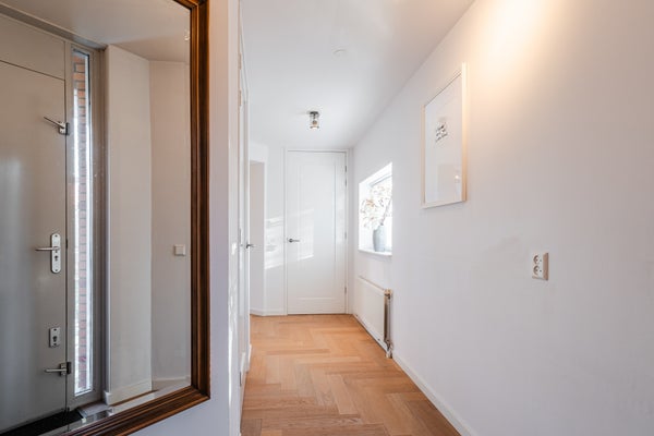 First floor: through the entrance, you enter the spacious hallway, which provides access to the walk-in closet or, if desired, can be used as a study. The hallway also provides access to the utility room with the washing machine connection, central heating boiler, and mechanical ventilation (MV-box). The modern, spacious bathroom features a walk-in shower and a beautifully finished concrete vanity with a washbasin. There is also a separate toilet with a hand basin. The very generous bedroom offers direct access to the southeast-facing balcony. The living room is remarkably spacious and, thanks to its corner location and numerous windows, exceptionally bright. The unique, pointed layout gives the room its own character. The modern kitchen seamlessly complements this and features a cozy breakfast bar. The kitchen is equipped with a 5-burner gas cooktop, extractor hood, oven, microwave, refrigerator with a small freezer compartment, and a dishwasher.