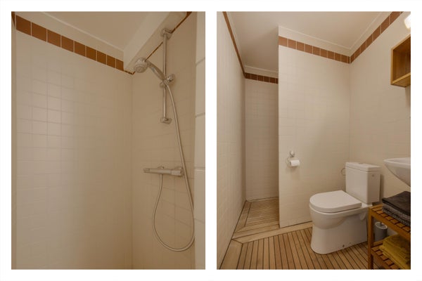 Moderne badkamer met inloopdouche (dubbele douche en stortdouche), wastafel en toilet.