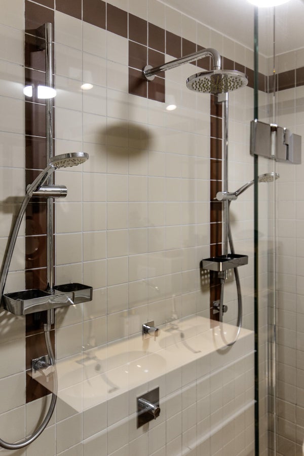 Modern bathroom with walk-in shower (double shower and rain shower), sink, and toilet.
