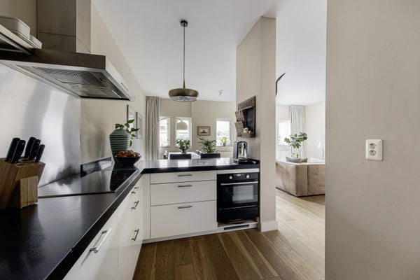 Modern semi-open kitchen in a U-shape with various built-in appliances, namely: refrigerator, freezer, combi oven/steam oven, dishwasher, and Quooker.