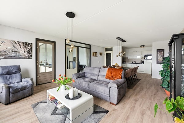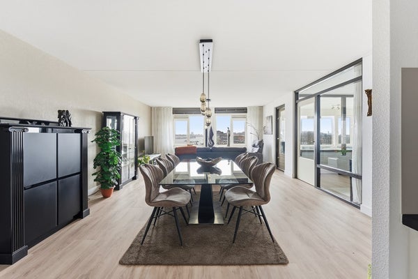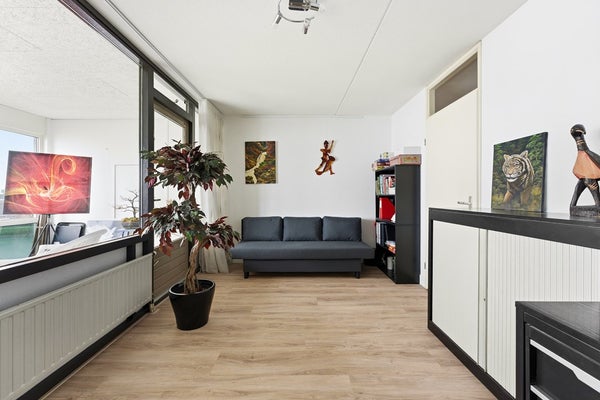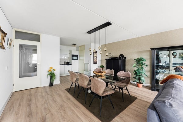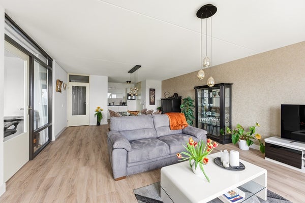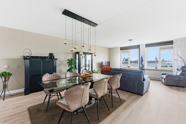 Woonkamer: De woonkamer is licht en royaal, met grote raampartijen die zorgen voor een prachtig zicht op de rivier Beneden Merwede en de skyline van Dordrecht, Zwijndrecht en bij helder weer zelfs Rotterdam. Dankzij de prettige afmetingen laat de ruimte zich eenvoudig indelen met een comfortabele zithoek bij het raam en een ruime eethoek nabij de keuken. Hier is met gemak plaats voor een grote eettafel, ideaal om uitgebreid te dineren of gasten te ontvangen. Aansluitend bevindt zich de loggia op het westen, een heerlijke plek om in alle rust te ontspannen en te genieten van de middag- en avondzon. De ruimte is verzorgd afgewerkt met een pvc-vloer, behangwanden en een spuitwerk plafond.