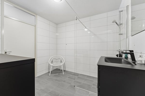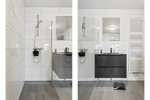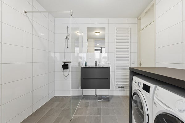 Badkamer: De badkamer is inpandig bereikbaar via de hal en de slaapkamer aan de voorzijde. Deze moderne ruimte is volledig betegeld en voorzien van een inloopdouche, wastafelmeubel met geïntegreerde wastafel, designradiator en aansluiting voor wasmachine en droger. De wasmachine en droger zijn keurig weggewerkt in de ombouw, waardoor het praktisch te gebruiken is.