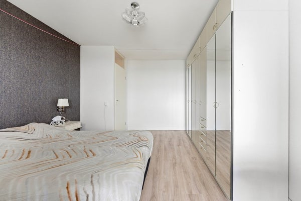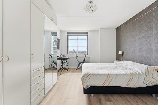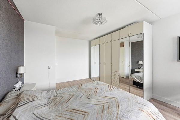 Slaapkamer 1: De masterbedroom, slaapkamer één, bevindt zich aan de galerijzijde en is royaal van formaat. Er is een stroomaansluiting voor televisie aanwezig. Ook deze kamer is afgewerkt met pvc-vloer, behangwanden en een spuitwerkplafond, wat een samenhangend geheel met de rest van het appartement vormt.