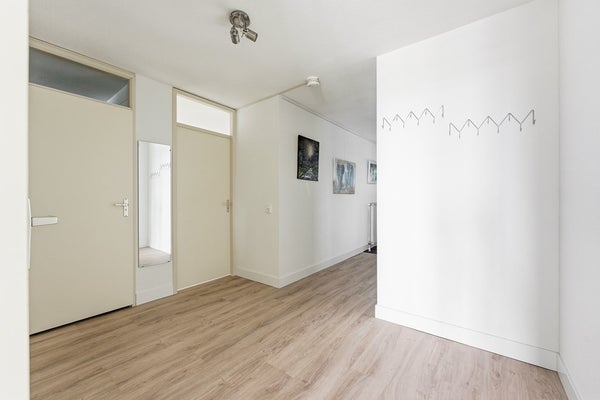 Entree: U komt het appartement binnen in een lange hal en vanuit deze centrale ruimte heeft u toegang tot de woonkamer, toilet, garderobekast, badkamer en slaapkamer. In de garderobekast treft u de Cv-ketel en mechanische ventilatie aan. Het hele appartement is voorzien van een nieuwe pvc-vloer, nieuwe wandafwerking en een spuitwerk plafond.