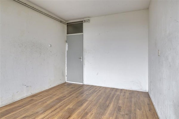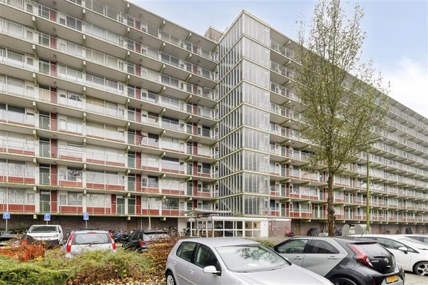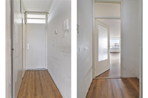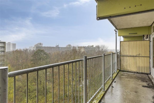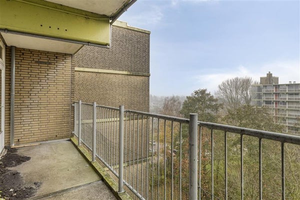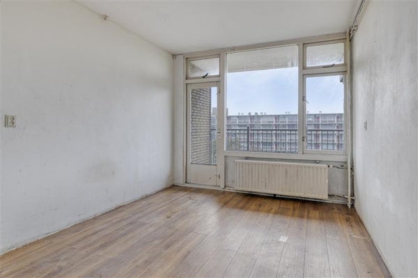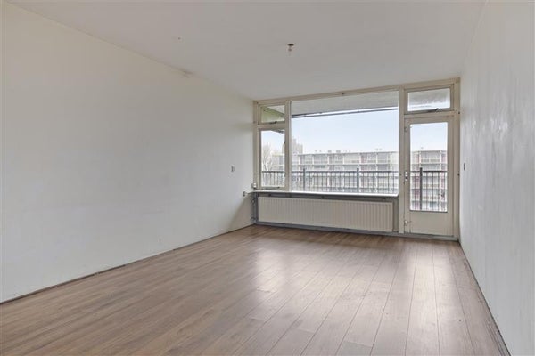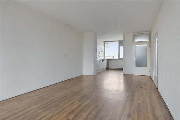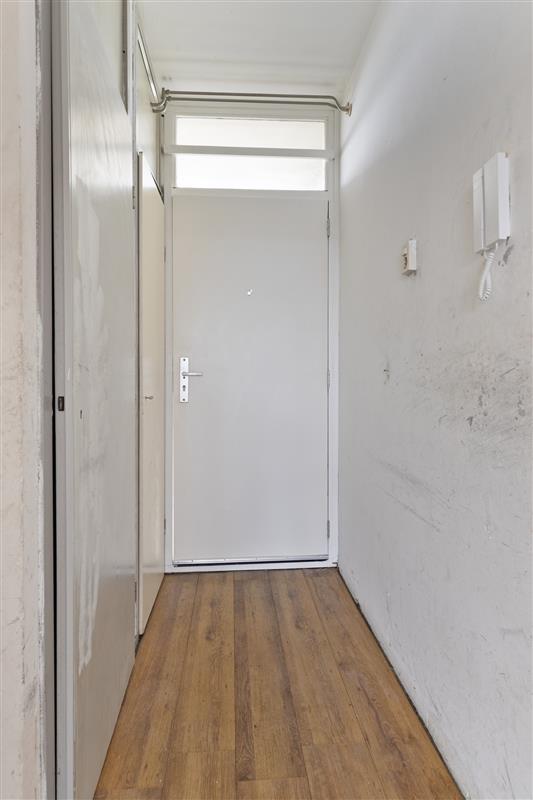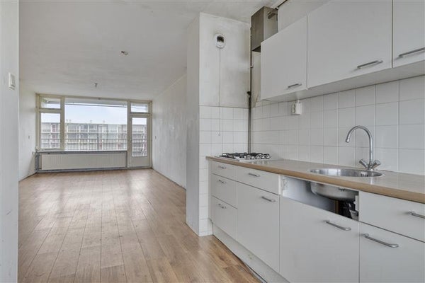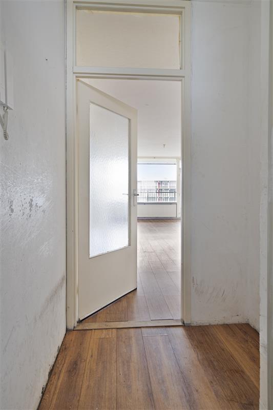 Stap binnen via een royale centrale ontvangsthal met intercominstallatie, brievenbussen en toegang tot de dubbele lift. Op de 8e verdieping treft u een lichte hal met meterkast en garderobe, die leidt naar de ruime woonkamer. Dankzij de zuidgerichte raampartijen en het grote balkon, kunt u op elk moment genieten van natuurlijk licht, ongeacht het weer. De indeling is doordacht: de basiskeuken bevindt zich aan de voorzijde van de woning, wat ruimte creëert voor een gezellige eet- en zithoek. De keuken biedt volop potentie voor wie er wat liefde en vernieuwing in wil steken. Let op: de huidige gasaansluiting wordt binnenkort overbodig, zodat elektrisch koken de toekomst wordt.