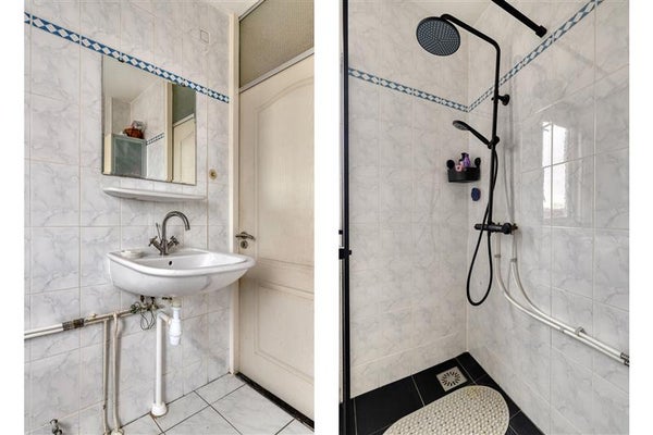 De volledig betegelde badkamer is eveneens voorzien van een douche, wastafel, toilet en een handige wasmachineaansluiting. Bovendien zorgt het raam voor een natuurlijke ventilatie.