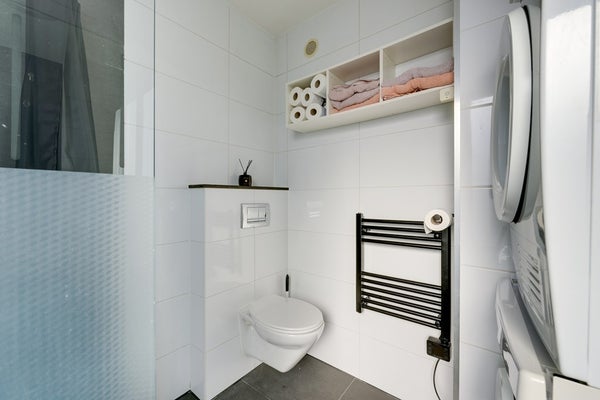 De royale keuken (2021) is uitgevoerd in een praktische L-opstelling met extra kastenwand en bar. Een echte eyecatcher én van alle gemakken voorzien. Je beschikt hier over hoogwaardige Siemens inbouwapparatuur, waaronder een vaatwasser, kookplaat met geïntegreerde afzuiging, koel-/vriescombinatie, combi-oven en een Quooker. Het composiet werkblad geeft het geheel een luxe en duurzame afwerking. De slaapkamer (circa 13 m²) is ruim opgezet en voorzien van een praktische inbouwkast. De moderne badkamer beschikt over een inloopdouche, wastafelmeubel, toilet en aansluitingen voor de wasmachine. Aan de achterzijde van het complex bevindt zich bovendien een eigen houten berging met elektra, bereikbaar via de steeg.
