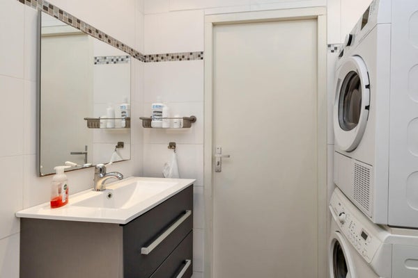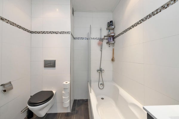 Vanuit de keuken loopt u terug naar de hal en de volgende ruimte is de badkamer met toilet, netjes en voorzien van een wastafel, ligbad met combi douche en genoeg ruimte voor het plaatsen van een wasmachine en droger.