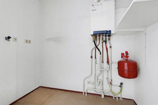 Deze bijkeuken is uitgerust met de cv-ketel en aansluitingen voor wasmachine en droger: ideaal voor extra bergruimte en huishoudelijke apparatuur.