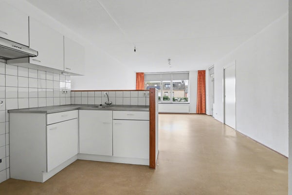 Heerlijke, lichte woonkamer met grote ramen en uitzicht over de omgeving. Vanuit de woonkamer stap je direct de loggia op, gelegen op het westen. De woonkamer staat in open verbinding met de keuken.