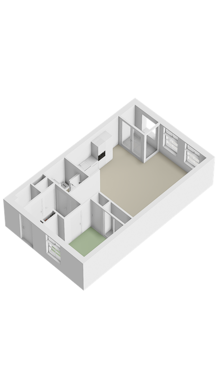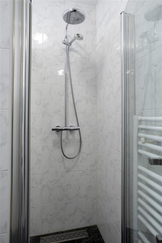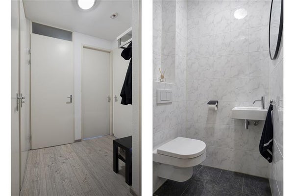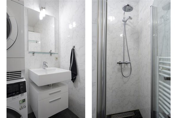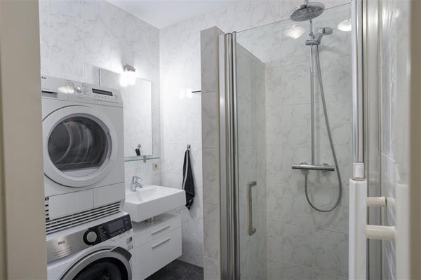 De slaapkamer is aangenaam van formaat en efficiënt ingericht. Met een vaste schuifkast én een extra nisje voor opslag heb je meer dan genoeg plek voor je spullen. Via de hal bereik je ook de badkamer, die slim gebruikmaakt van de beschikbare ruimte. Met een inloopdouche, wastafel en aansluitingen voor de wasmachine en droger is alles aanwezig wat je nodig hebt.