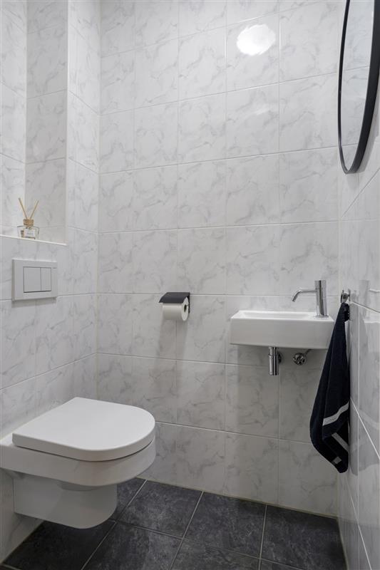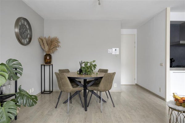 De woning zelf ligt op de eerste verdieping en is bereikbaar via een loopgang. Je betreedt het appartement via de hal, die alle vertrekken met elkaar verbindt. Met een woonoppervlakte van 59 m² voelt het appartement ruim en overzichtelijk aan. De woonkamer van circa 34 m² is een fijne plek om te ontspannen of te genieten van een maaltijd. Dankzij de hoogwaardige afwerking en de lichte sfeer zet je hier snel jouw eigen stempel op.