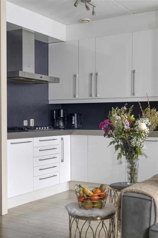 De keuken, opgesteld in een praktische hoekopstelling, biedt veel mogelijkheden. Het gemak van moderne apparatuur – zoals een vaatwasser, combimagnetron met warmtelade en koelkast – maakt koken hier plezierig. Ook is er volop bergruimte, waardoor je alles netjes uit het zicht kunt opbergen.