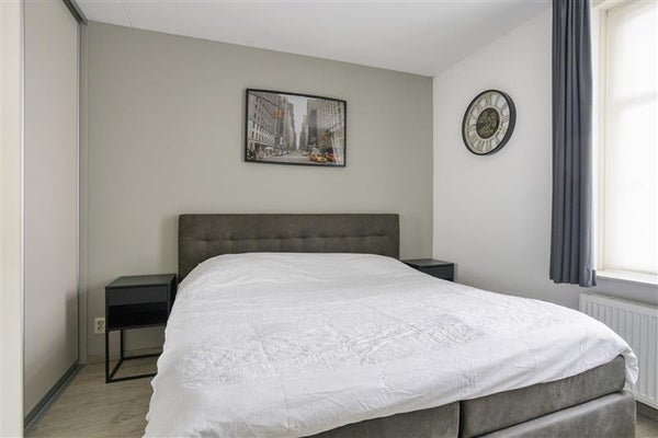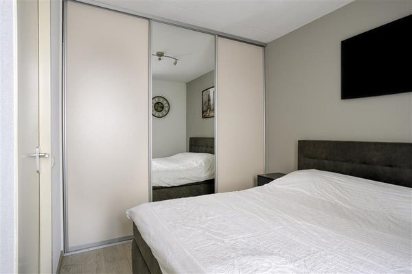 Slaapkamer met kastruimte: De slaapkamer is voorzien van een vaste inbouwkast met schuifdeuren en een grote raampartij voor veel daglicht.