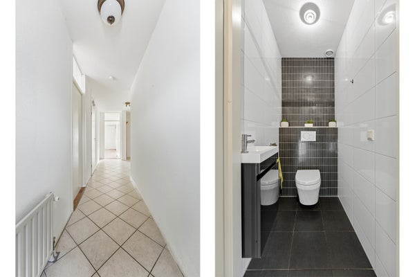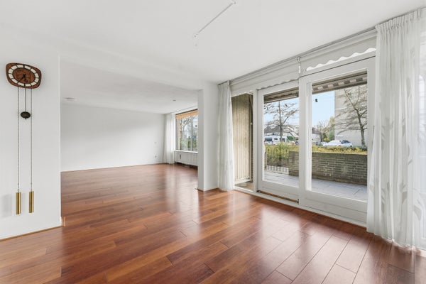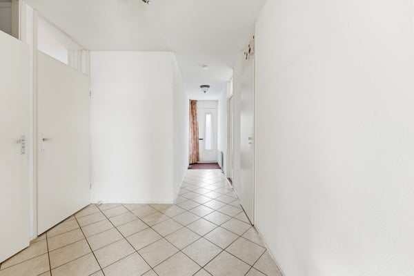 Bij binnenkomst in de ruime hal zijn er toegang tot twee slaapkamers, de badkamer, toiletruimte en de lichte woonkamer. De logeerkamer heeft een inbouwkast. De badkamer beschikt over een inloopdouche en wastafelmeubel. Door de combinatie van de voormalige slaapkamer en woonkamer is deze extra groot. Een schuifpui biedt toegang tot de tuin. Daarnaast zijn er een open L-vormige keuken en een bergruimte met CV-installatie.