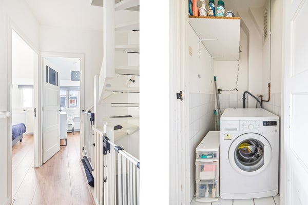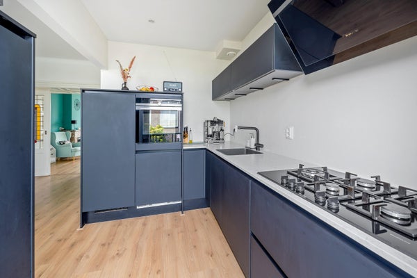 De indeling omvat een eigen trap naar de eerste etage, waar zich de L-vormige ensuite living en de halfopen keuken met Siemens apparatuur bevinden. Op de tweede verdieping zijn drie slaapkamers en een moderne badkamer. De derde verdieping herbergt de vierde slaapkamer en het dakterras. Deze woning heeft een 1/7e aandeel in een VvE met een bijdrage van € 133,80 per maand.