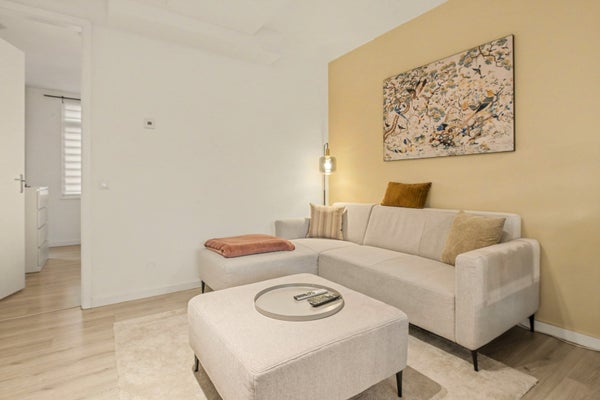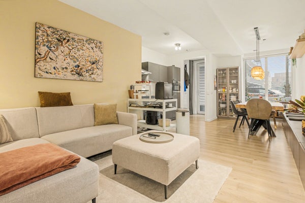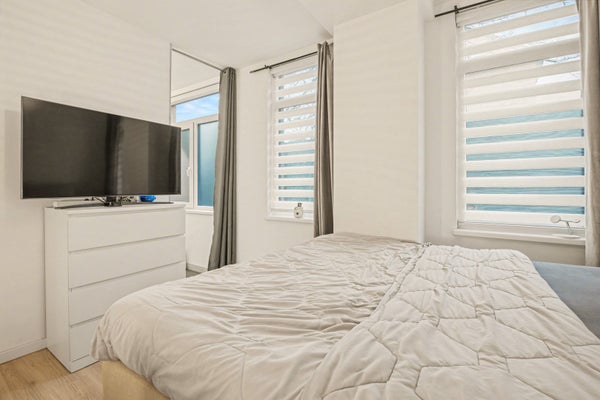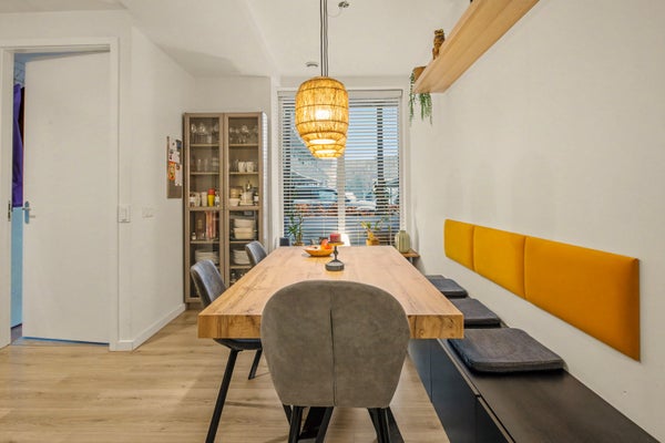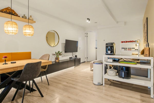 In de knusse woonkamer kun je heerlijk relaxen met een goed boek of je favoriete serie. En natuurlijk past er ook een eettafel in waar je met je vrienden of familie gezellig aan kunt tafelen. Doordat de keuken open is, kun je makkelijk onder het koken kletsen met je bezoek.