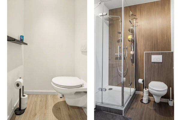 De moderne badkamer beschikt over een wastafelmeubel met opberglades voor al je producten, een douche en toilet.