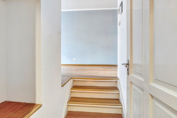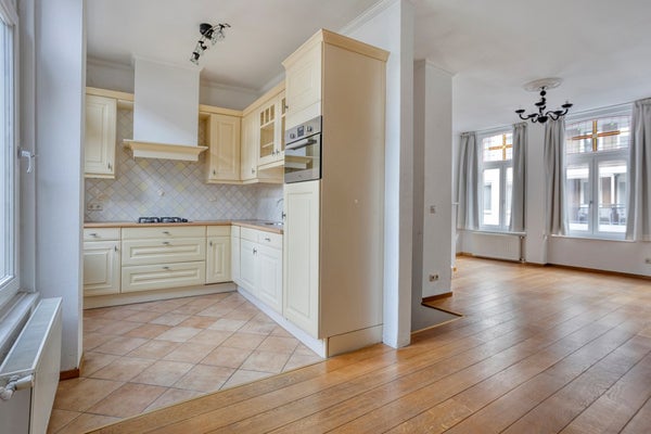 Via de nette gezamenlijke entree bereik je het appartement. In de onderbouw bevindt zich een fraaie gewelfde kelder, ideaal voor extra opslag. Bij binnenkomst in de woning vallen direct het hoge plafond en de authentieke glas-in-loodramen op, die zorgen voor een karaktervolle uitstraling.