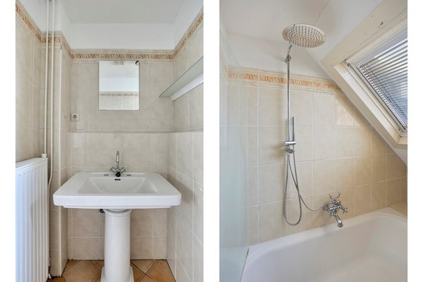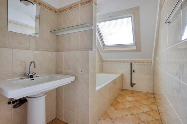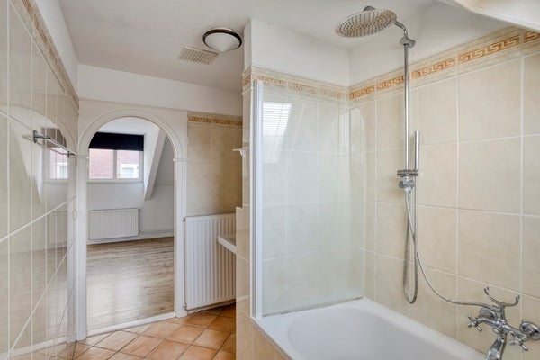 Op de bovenste verdieping bevinden zich twee volwaardige slaapkamers. De hoofdslaapkamer beschikt over vaste kasten en een dakkapel voor extra licht en ruimte. Aangrenzend ligt de badkamer, uitgerust met een ligbad, wastafel, wasmachineaansluiting en Velux dakraam. Op de overloop is een separaat toilet aanwezig en via een vlizotrap bereik je de vliering, ideaal als extra bergruimte.