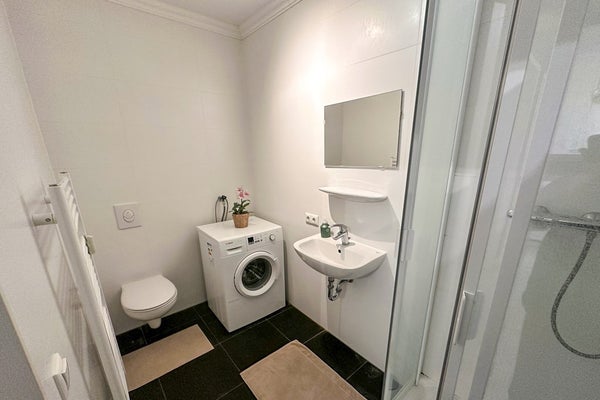 De badkamer (ca. 4 m²) is compleet uitgevoerd met een inloopdouche, zwevend toilet, wastafel, verwarmd handdoekenrek en wasmachine.