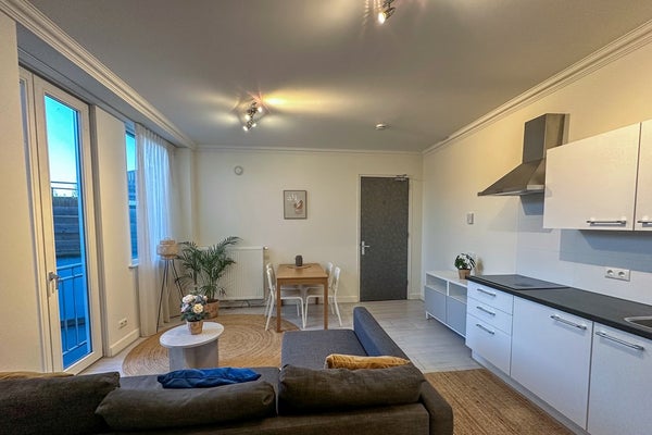 Bij binnenkomst valt direct de lichte woonkamer met open keuken op (ca. 20 m²). De keuken is voorzien van een inductiekookplaat, afzuigkap, combimagnetron en koelkast. Het gehele appartement is afgewerkt met een nette, lichte laminaatvloer.
