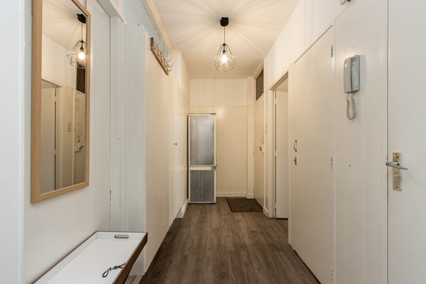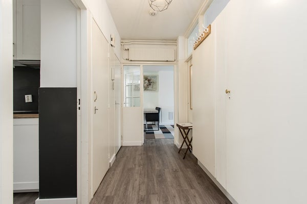 Bij binnenkomst betreden we de ruime hal met vernieuwde meterkast, toegang tot de keuken en het toilet. Het appartement overalafgewerkt met een mooie laminaatvloer.