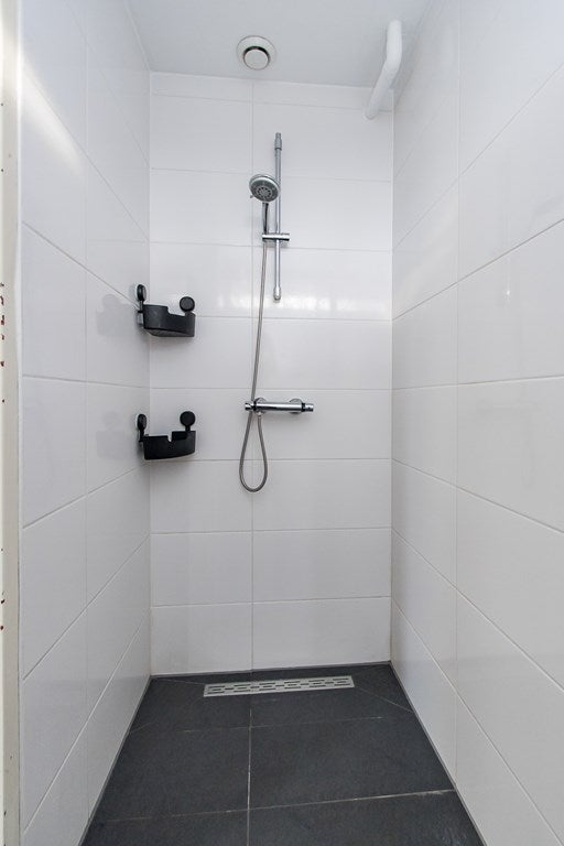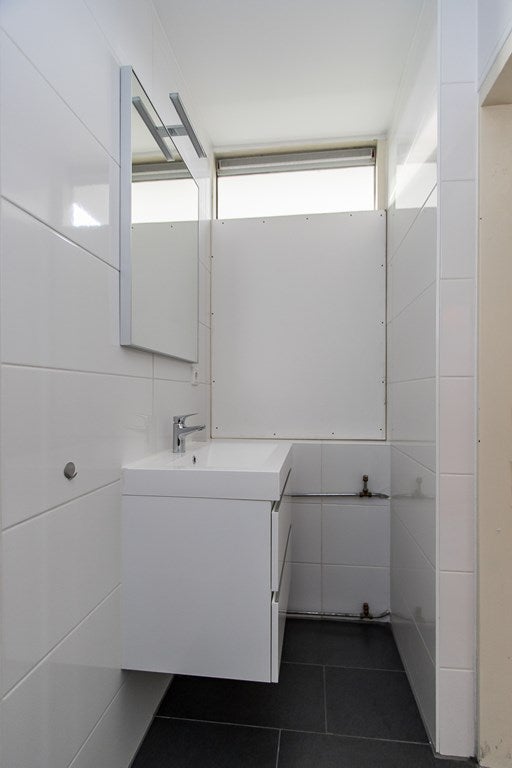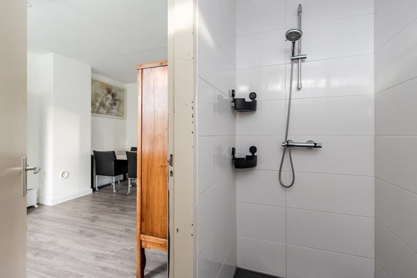 De vernieuwde badkamer (2024), welke is betegeld met een moderne witte tegel. De badkamer is voorzien van een ruime inloopdouche, wastafel met meubel.