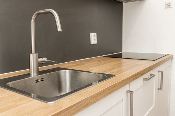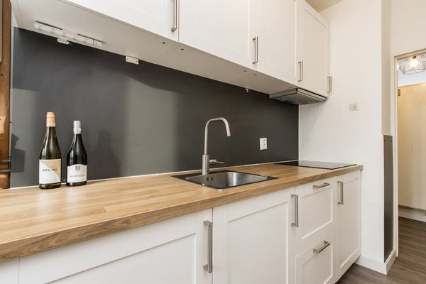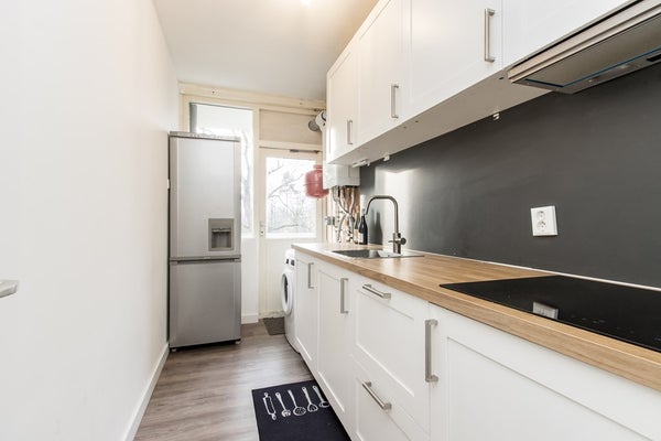 De aparte lichte keuken is geplaatst in een rechte opstelling en is voorzien van de volgende inbouwapparatuur: 4-pits inductiekookplaat, afzuigkap, spoelbak, combimagnetron, koelkast en opbergruimte in de kastjes en lades. Teven het aansluitpunt voor de wasmachine en opstelling van de CV (2022).