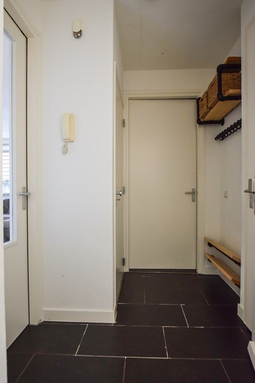 Vanuit de centrale entreehal van het appartementengebouw bereik je de voordeur van het appartement.