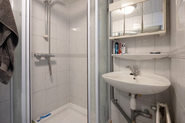 Op de eerste verdieping bevinden zich drie slaapkamers en een badkamer met douche en wastafel. De slaapkamers zijn royaal van formaat en bieden voldoende ruimte voor opbergmogelijkheden. De badkamer, hoewel compact, is functioneel ontworpen voor dagelijks gebruik.