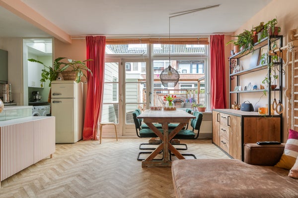 Bij binnenkomst wordt u welkom geheten in de hal, die toegang biedt tot de meterkast, een praktische bergkast en badkamer en woonkamer. De woonkamer is een heerlijke, lichte ruimte met een prettige sfeer. Via twee authentieke schuifdeuren bereikt u de master bedroom aan de voorzijde van de woning, wat zorgt voor een charmante en karaktervolle uitstraling. De open keuken staat in directe verbinding met de woonkamer en is van alle gemakken voorzien, waaronder een inductiekookplaat, afzuigkap, oven, vaatwasser en een koel-vriescombinatie. De koel-vriescombinatie kan worden overgenomen conform de lijst van zaken. Vanuit de keuken is de bijkeuken bereikbaar, waar zich de was- en droogopstelling bevindt.