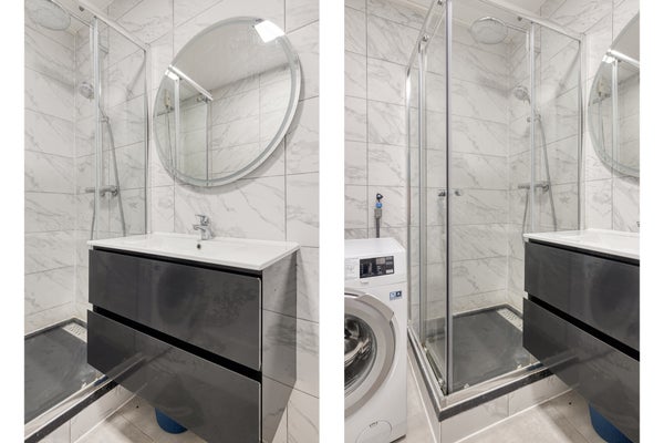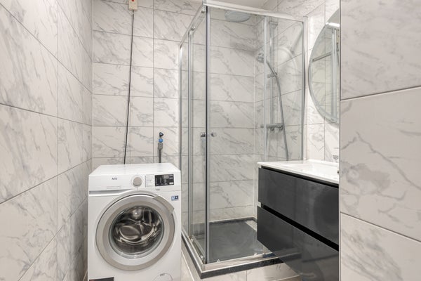 - De geheel betegelde badkamer is voorzien van een wastafel, douchecabine en wasmachine aansluiting;