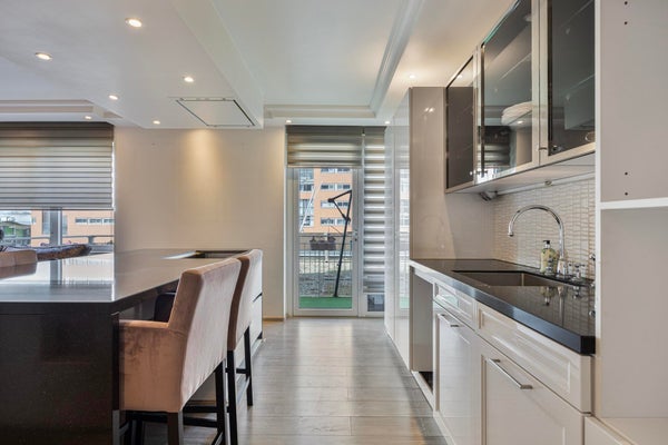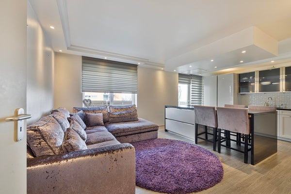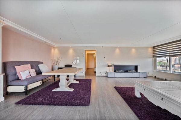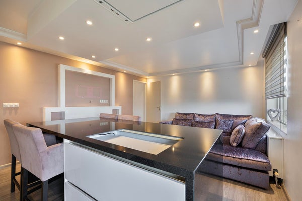 De royale woonkamer met open keuken vormt het hart van de woning. Dankzij de grote raampartijen geniet u van een overvloed aan daglicht, wat zorgt voor een lichte en ruimtelijke uitstraling.