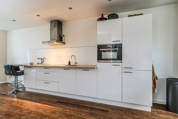 De strakke, witte keuken met chromen handgrepen en een licht werkblad in houtlook is volledig uitgerust met inbouwapparatuur, waaronder een vaatwasser, koel-/vriescombinatie, combioven en kookplaat.