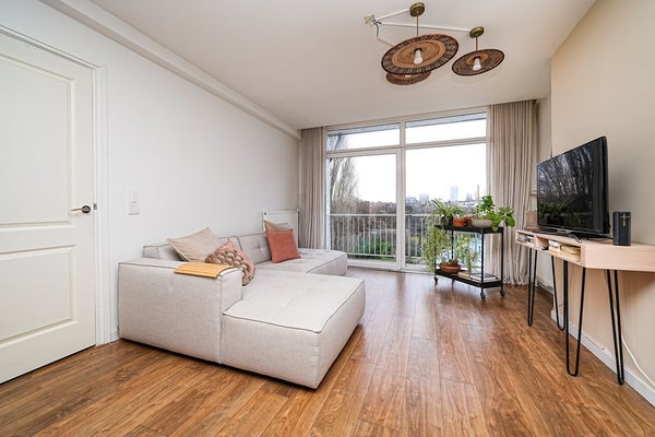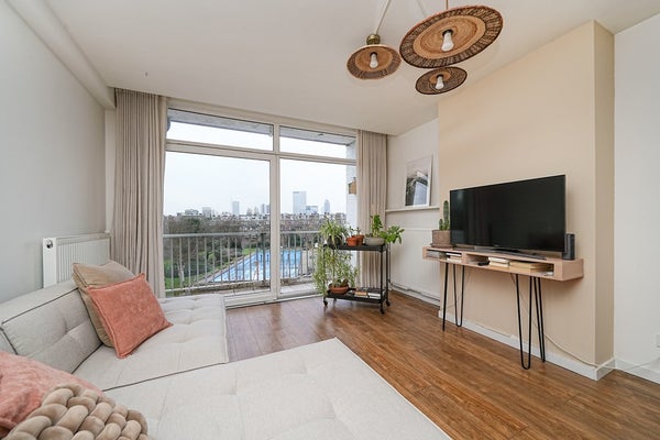 De woonkamer is heerlijk licht dankzij de grote raampartijen en heeft een verrassende, functionele indeling. Aan de voorzijde bevindt zich een gezellige eethoek met ruimte voor een werkplek. Centraal in de ruimte ligt de keuken, terwijl het comfortabele zitgedeelte aan de achterzijde is gesitueerd. Via de schuifpui bereikt u het balkon op het zuidoosten.