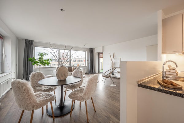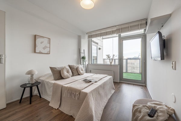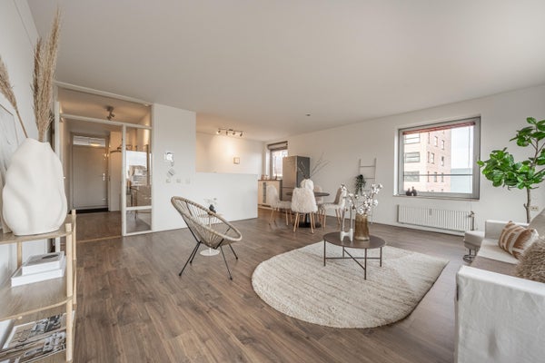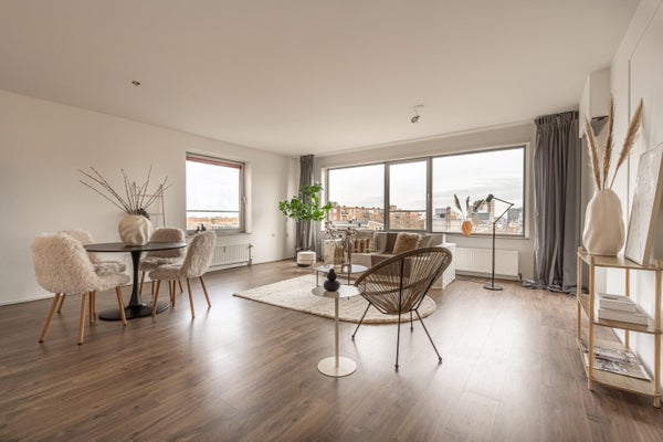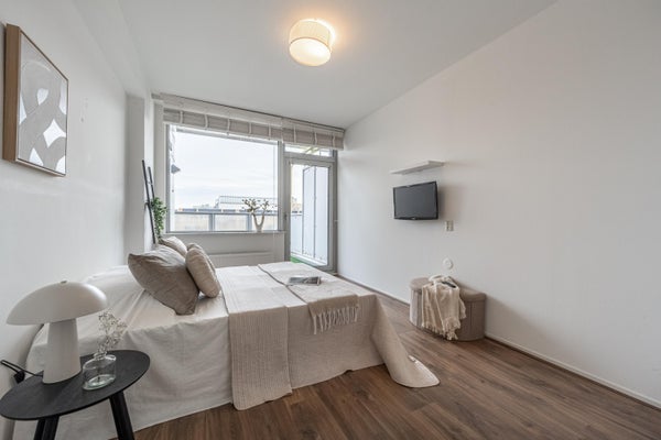 De woonkamer is opvallend licht door de raampartijen aan meerdere kanten. Je kijkt uit over de Hoogstraat en Mariniersweg, terwijl de ligging op de zevende verdieping zorgt voor rust en privacy. Vanuit de woonkamer heb je toegang tot het balkon – een fijne plek om buiten te zitten.