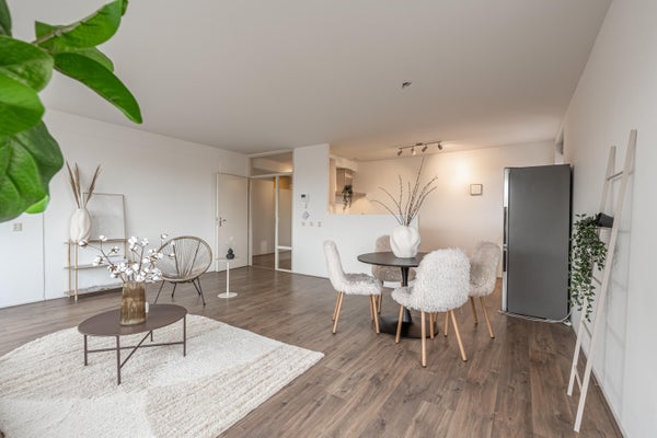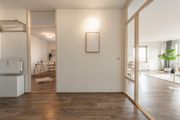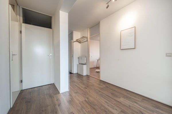 Door het hele appartement ligt een donkerbruine laminaatvloer, wat zorgt voor een rustige en uniforme uitstraling. De woning is voorzien van een video-deurbel waarmee je vanuit de woonkamer gasten toegang kunt geven tot de centrale entree. Alle ramen zijn uitgevoerd als draaikiepramen.