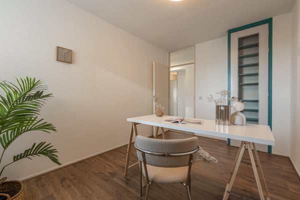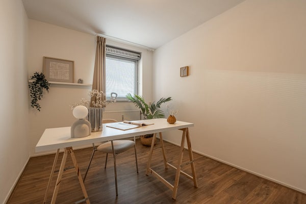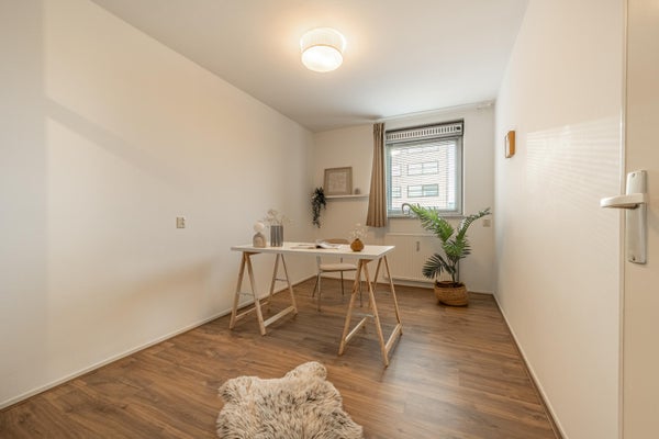 De tweede slaapkamer bevindt zich aan de achterzijde en grenst direct aan het balkon. Dankzij de grote raampartij is de kamer bijzonder licht. De slaapkamer beschikt over een inloopkast, die voorheen als berging werd gebruikt. Deze ruimte kan eenvoudig weer als berging worden ingericht of benut worden als royale kledingruimte. Ook is het mogelijk de wand tussen de slaapkamer en de woonkamer te verwijderen, waardoor een extra grote leefruimte ontstaat.