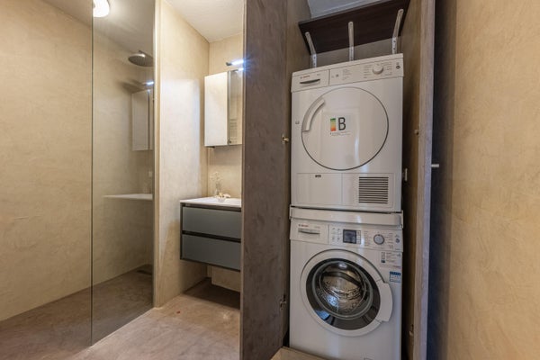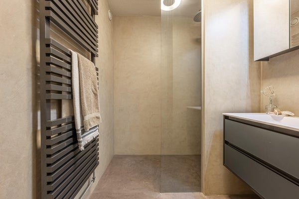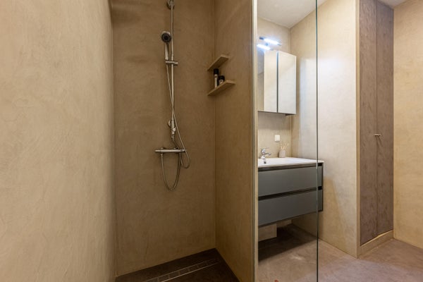Modern afgewerkt in betonlook met een epoxy vloer en wanden in dezelfde stijl. De badkamer beschikt over een ruime inloopdouche, een wastafelmeubel met bergruimte, een designradiator en aansluitingen voor wasmachine en droger.