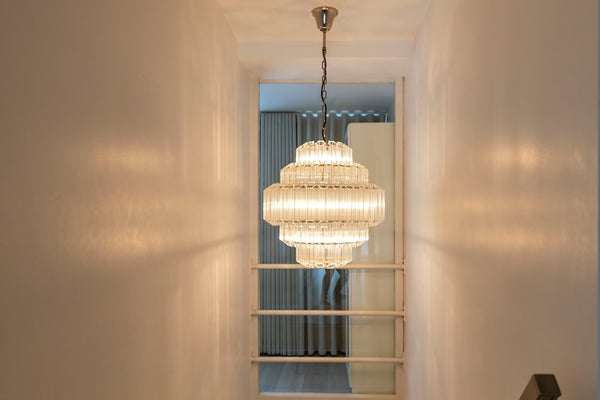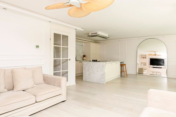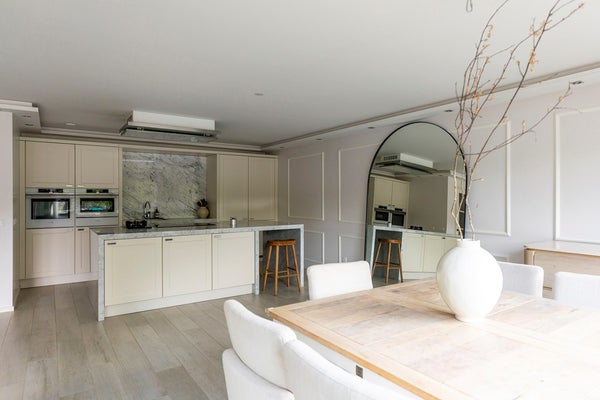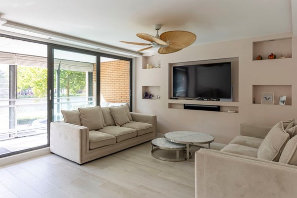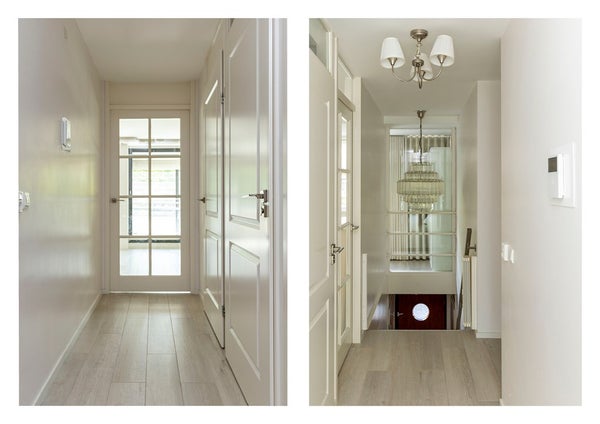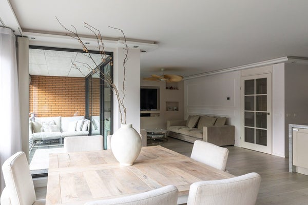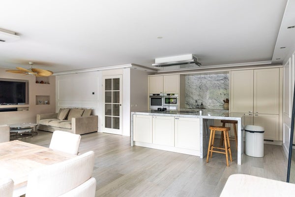 De woonkamer strekt zich uit over de volle breedte van de woning en is prachtig afgewerkt met sierlijsten, strak stucwerk en een fraaie vloer. Dankzij de grote raampartijen is het hier heerlijk licht. De luxe open keuken vormt het hart van de ruimte en nodigt uit tot gezellig koken en samenzijn.