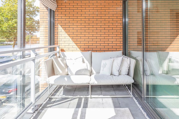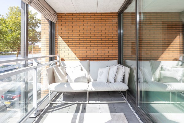 Vanuit de woonkamer stapt u zo het balkon/serre op, dat dankzij de glazen schuifwanden volledig af te sluiten is. Hierdoor geniet u hier het hele jaar door van een heerlijke extra leefruimte, met uitzicht op het water.