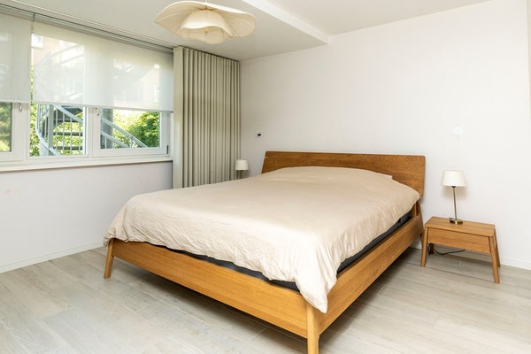 Aan de achterzijde bevinden zich twee riante slaapkamers, rustig gelegen en van prettig formaat. De zeer luxe badkamer is royaal opgezet en voorzien van een grote inloopdouche met glazen wand, thermostaatkraan, regen- en handdouche, een wastafel met meubel, spiegel en een tweede zwevend toilet. Daarnaast is er in de hal nog een separate, ruime toiletruimte voor gasten.